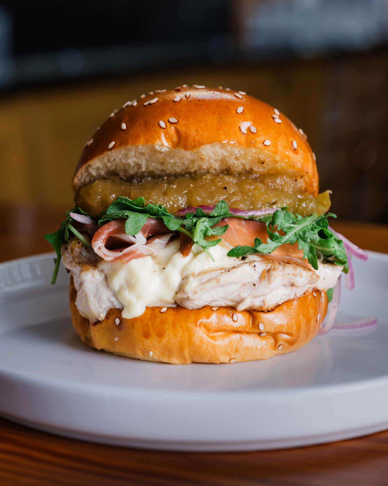 grilled chicken, melted brie, prosciutto, arugula and red onion, white balsamic apple jam